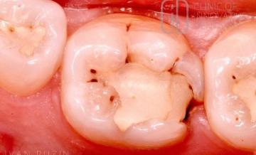 76 Исходная ситуация. Поэтапный протокол: 1. Удаление старой реставрации и пораженных тканей зуба. Дистальный фрагмент зуба 3.6 препарировался без использования коффердама, с целью облегчения некркэтомии в данном фрагменте. После удаления всех нежизнеспособных тканей с дистального фрагмента был наложен коффердам на зубы 3.7 – 3.4 для лучшей визуализации рабочего поля. Удаление инфицированного дентина в глубоких слоях […]