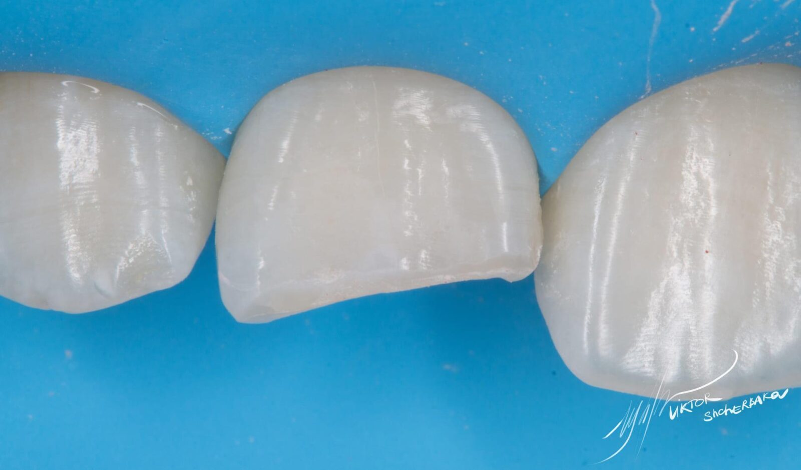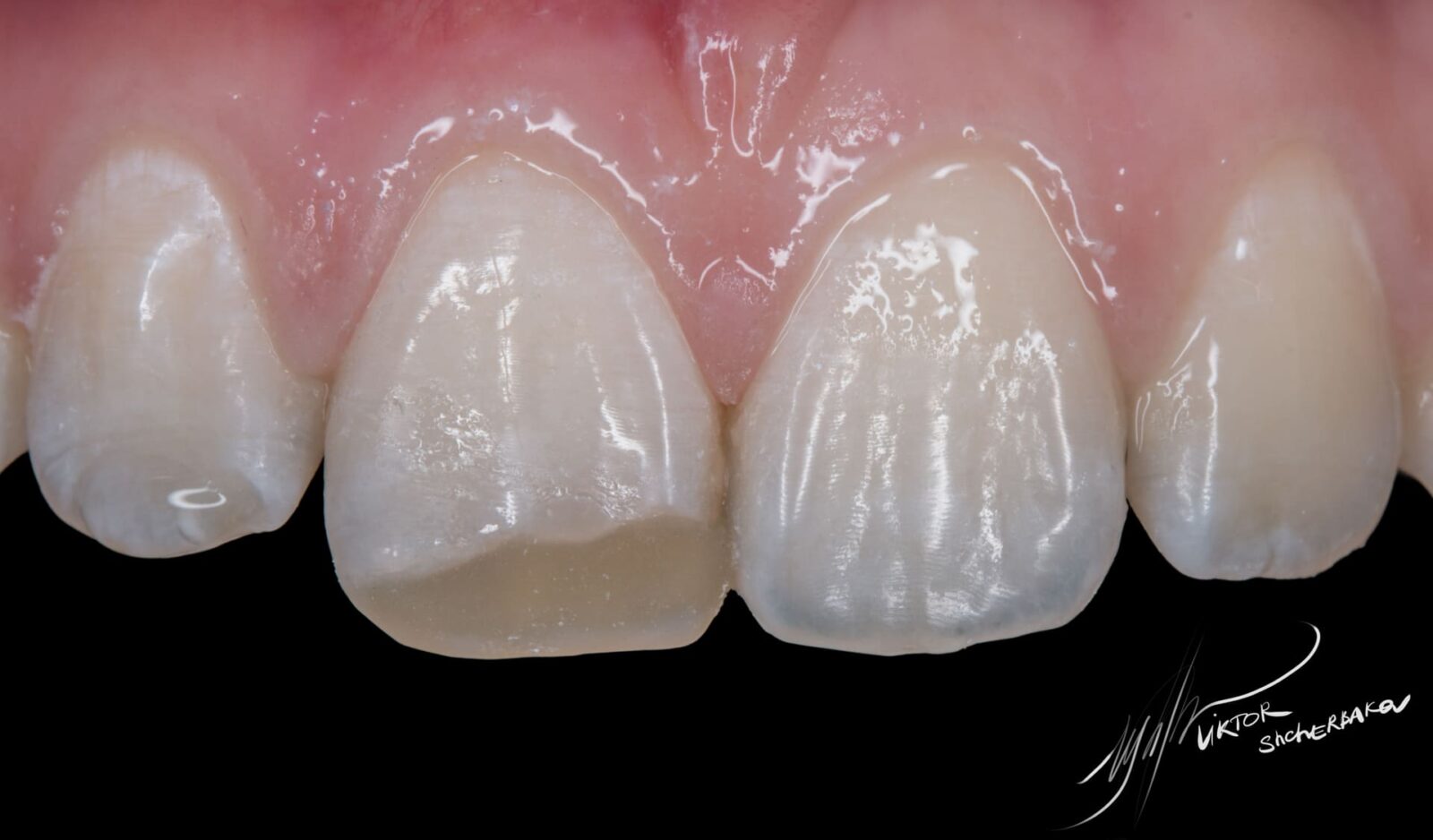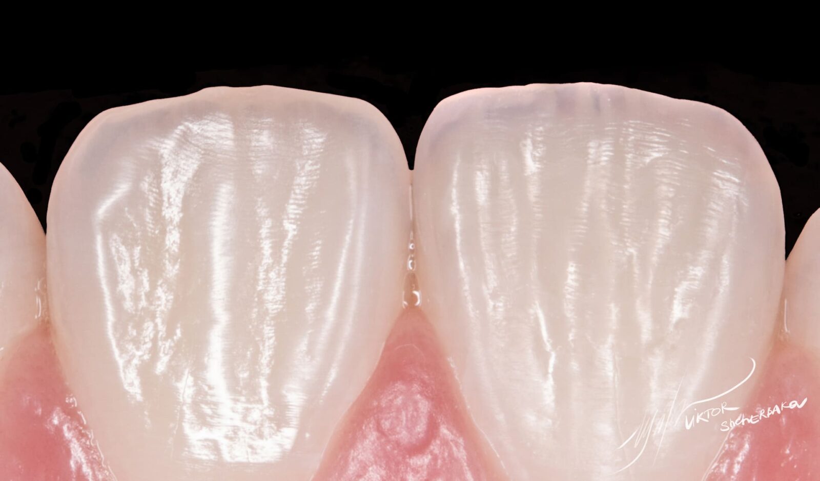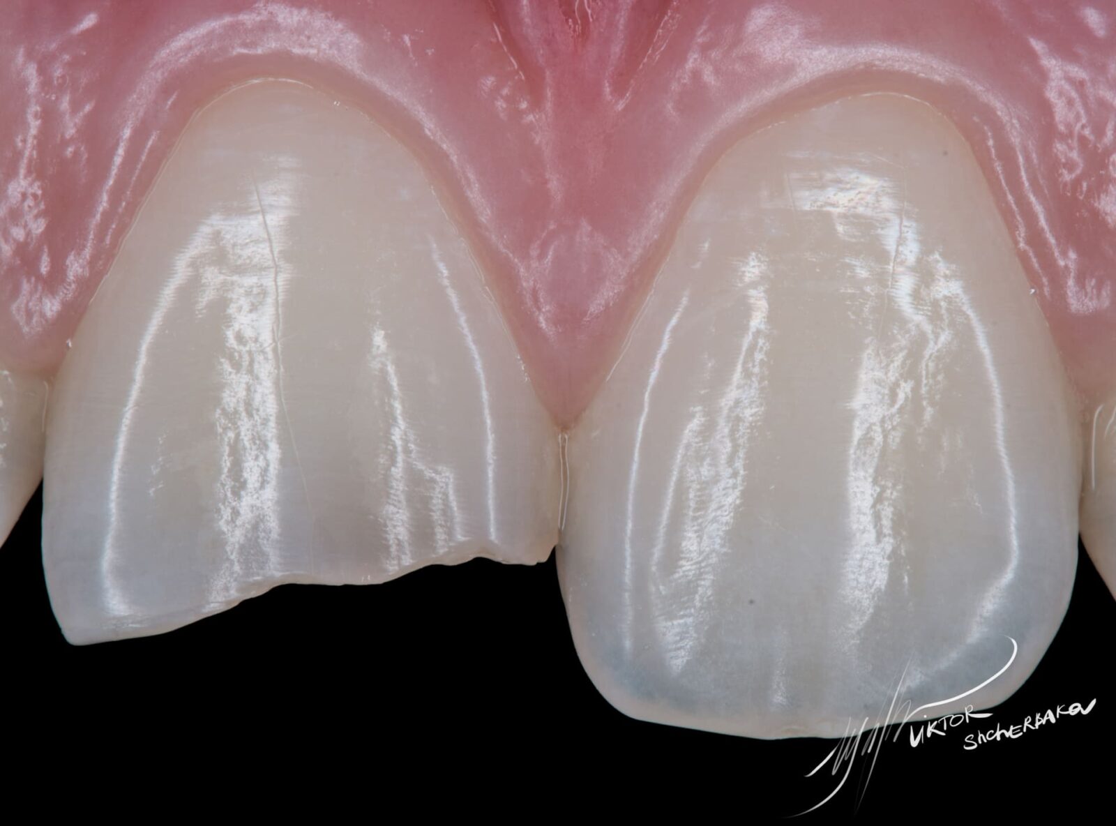 ENG Below Реставрация травматического скола, случившегося около 8 лет назад. Дентин Ceram-x DUO D3, D2 Основная эмаль Ceram-sphereTec A2 Кончики мамелонов Ceram-DUO D2, D1 Между мамелонами Estelite Color Clear + Tetric Color Blue точечно Поверхностная эмаль Asteria WE Restoration of a traumatic incisor fracture that happened about 8 years ago. Dentin core – Ceram-x DUO D3, D2 Main enamel layer – Ceram-sphereTec A2 Tips of mamelons – Ceram-DUO D2, D1 Between mamelons – Estelite Color Clear + Tetric Color Blue by a few dots The surface enamel layer – Asteria WE