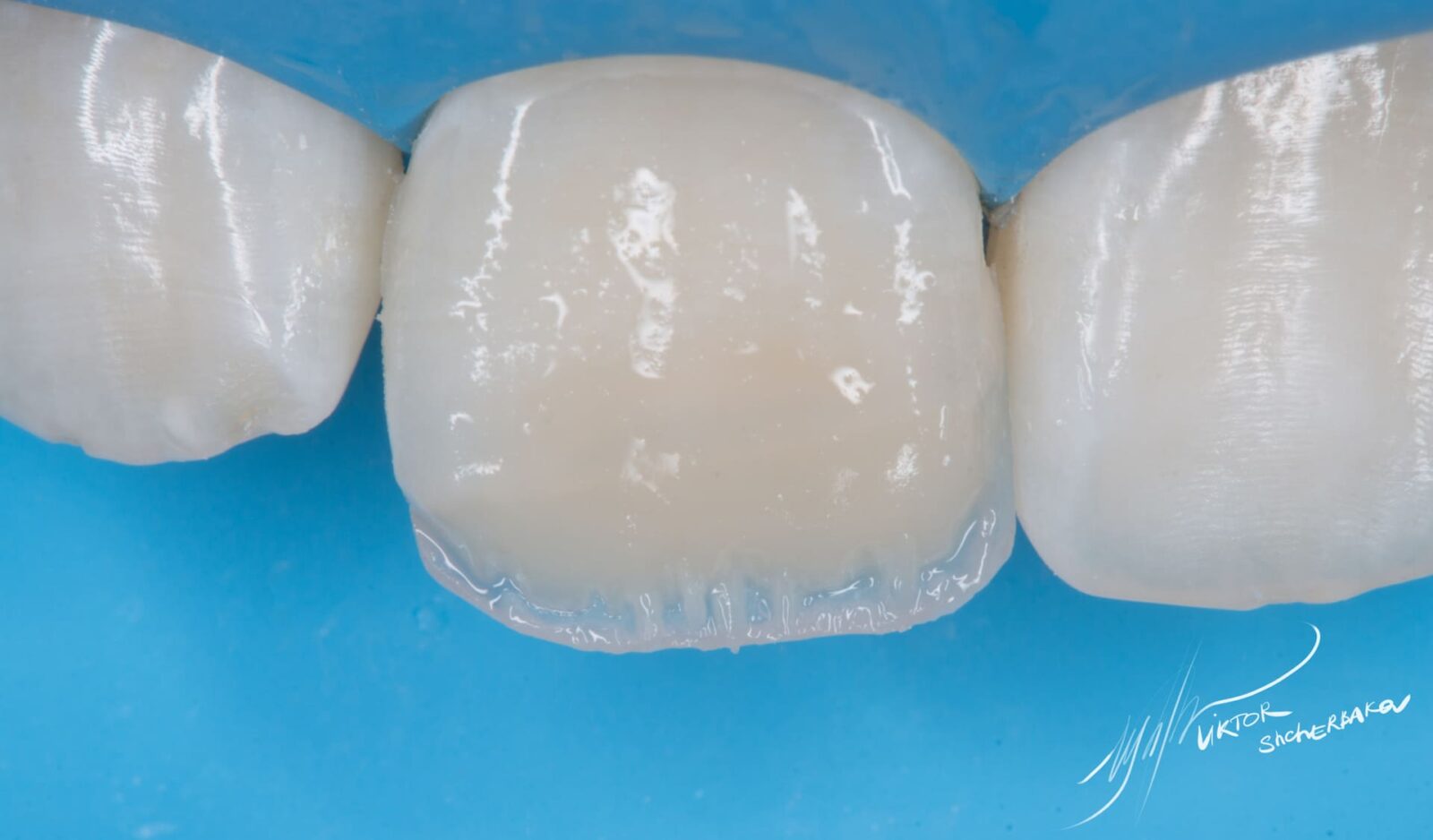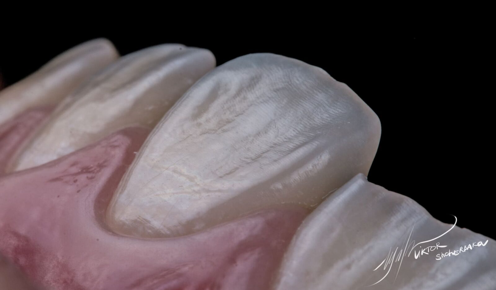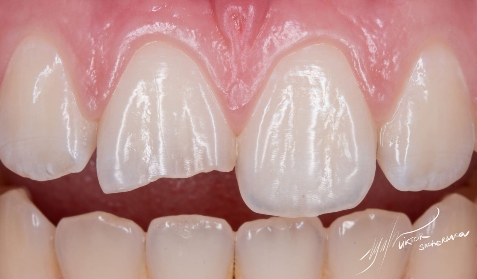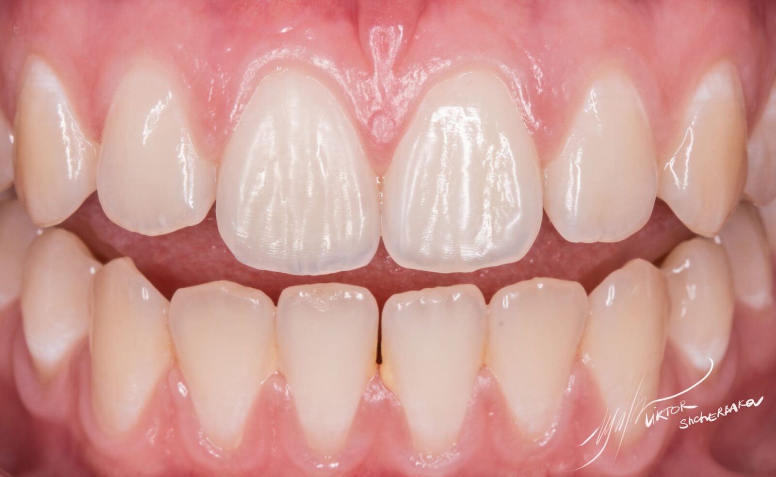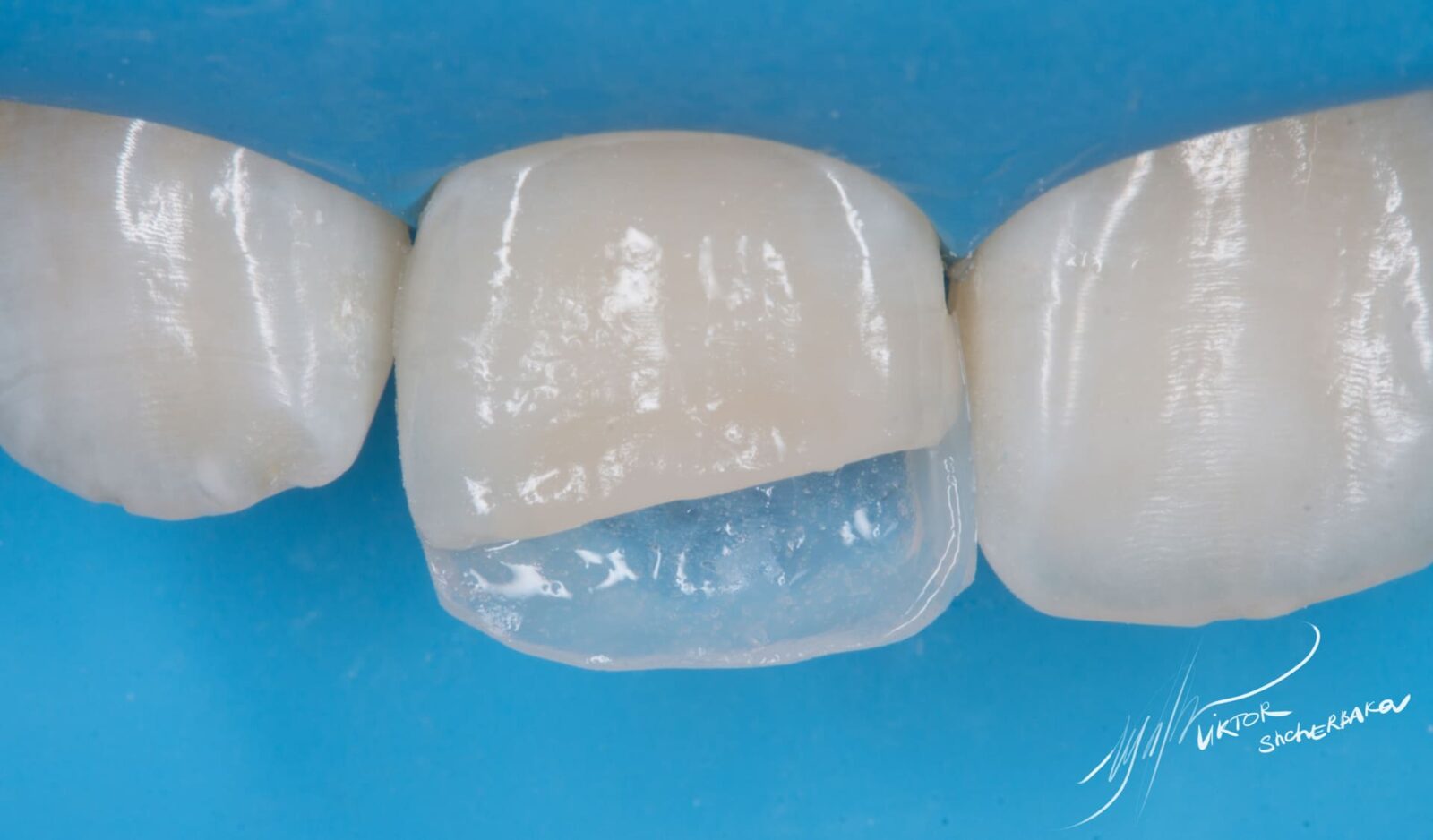 ENG Below Реставрация травматического скола, случившегося около 8 лет назад. Дентин Ceram-x DUO D3, D2 Основная эмаль Ceram-sphereTec A2 Кончики мамелонов Ceram-DUO D2, D1 Между мамелонами Estelite Color Clear + Tetric Color Blue точечно Поверхностная эмаль Asteria WE Restoration of a traumatic incisor fracture that happened about 8 years ago. Dentin core – Ceram-x DUO D3, D2 Main enamel layer – Ceram-sphereTec A2 Tips of mamelons – Ceram-DUO D2, D1 Between mamelons – Estelite Color Clear + Tetric Color Blue by a few dots The surface enamel layer – Asteria WE