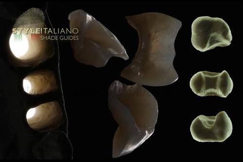 Рис.2. Модель по Геллеру, три гипсовых штампика и композитные реставрации.