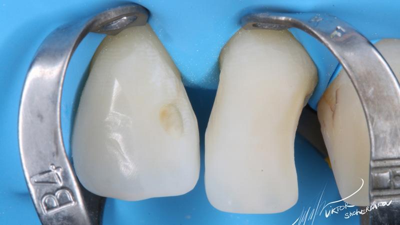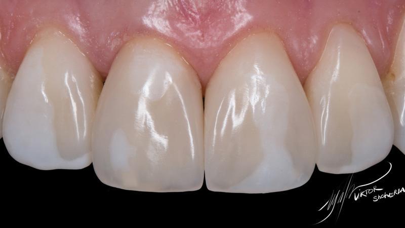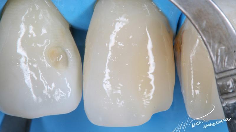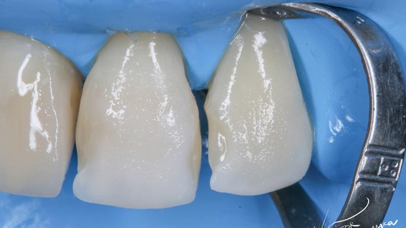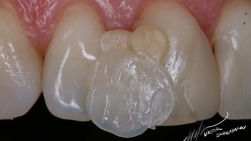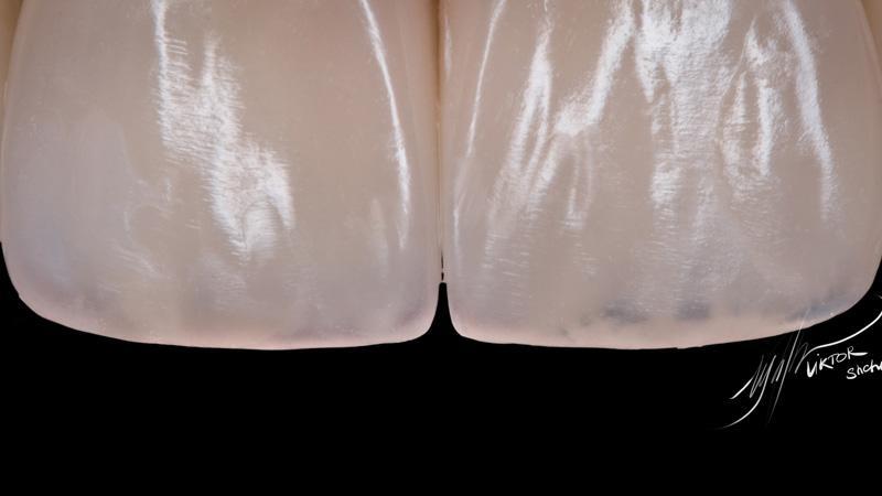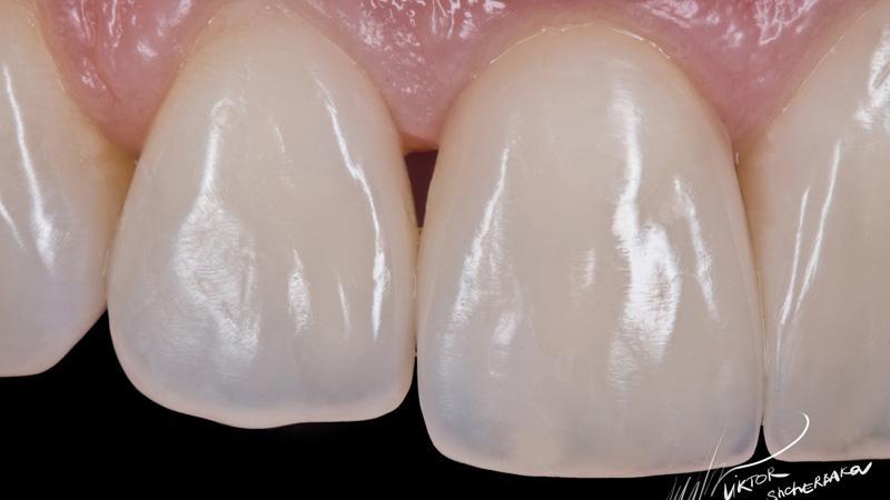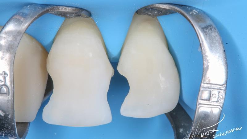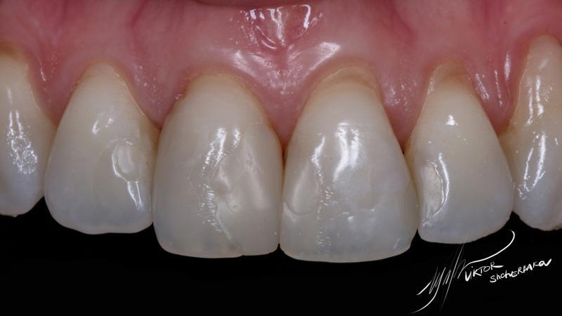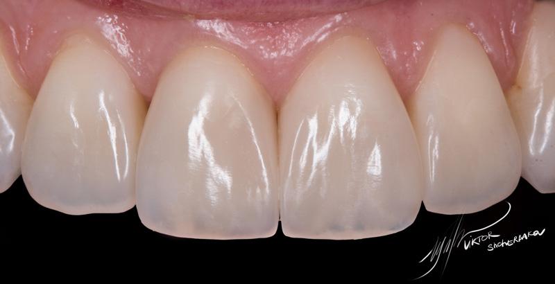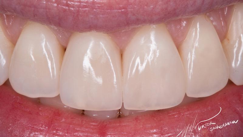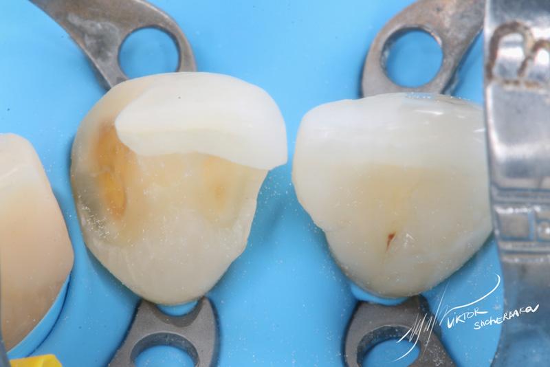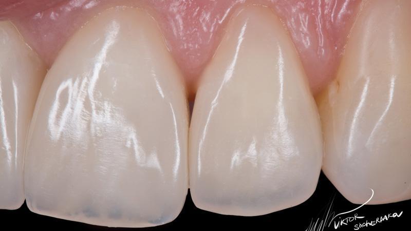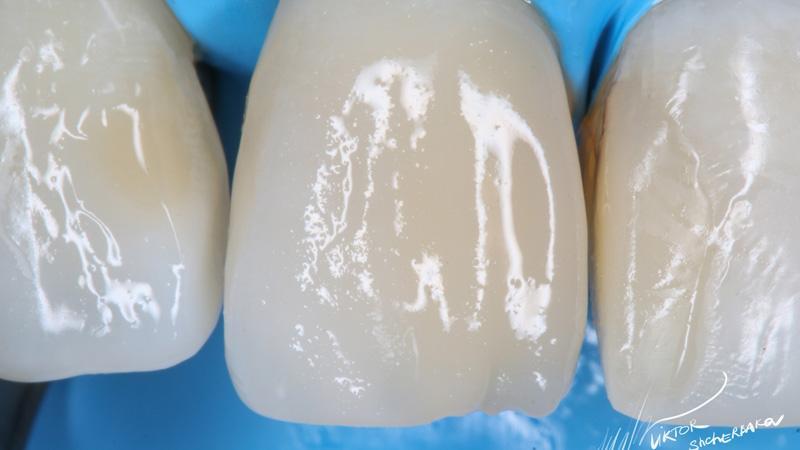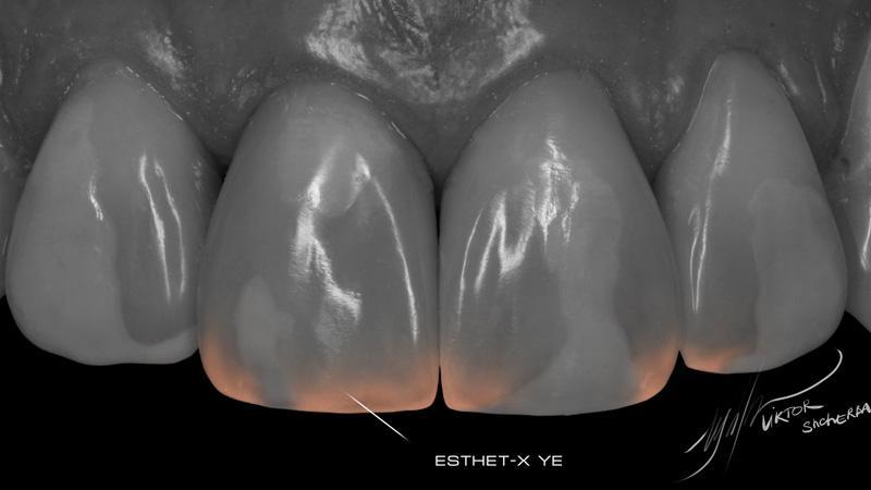 Поверхностная эмаль: Esthet-x YE + Estelite color Clear (между мамелонами)